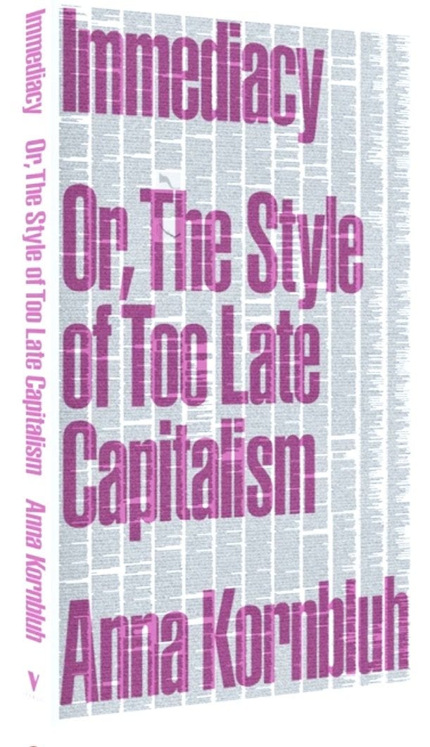 In my little corner of the internet, Anna Kornbluh’s new book Immediacy or, The Style of Too Late Capitalism has been everywhere lately. Its critique doesn’t shatter as much as it slices cleanly through any lingering illusions about the promise of the future while living in a capitalist regime that has already ruined the planet, and as such seems to have struck something of a nerve. Even for someone fairly well-read in critical theory, I experienced anew and throughout that particular combination of overwhelming dread and simultaneous excitement at the clarity of the diagnosis that was characteristic of my first encounters with Adorno, Jameson, and Marx. Indeed, the book is in part a kind of answer to Jameson, proceeding from the premise that postmodernism is no longer an adequate aesthetico-political framework for understanding our times.